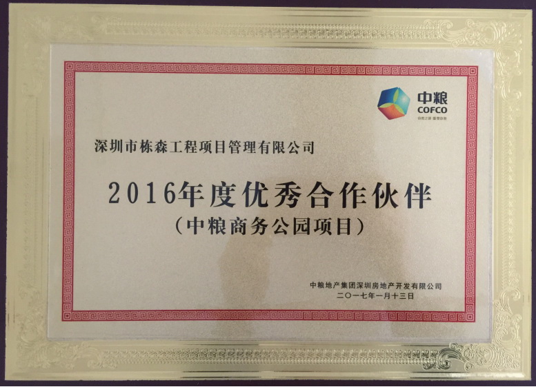 中糧地產集團深圳房地產開發(fā)有限公司2016年度優(yōu)秀合作伙伴