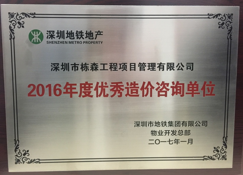深圳市地鐵集團有限公司物業開發(fā)總部2016年度優(yōu)秀造價咨詢單位